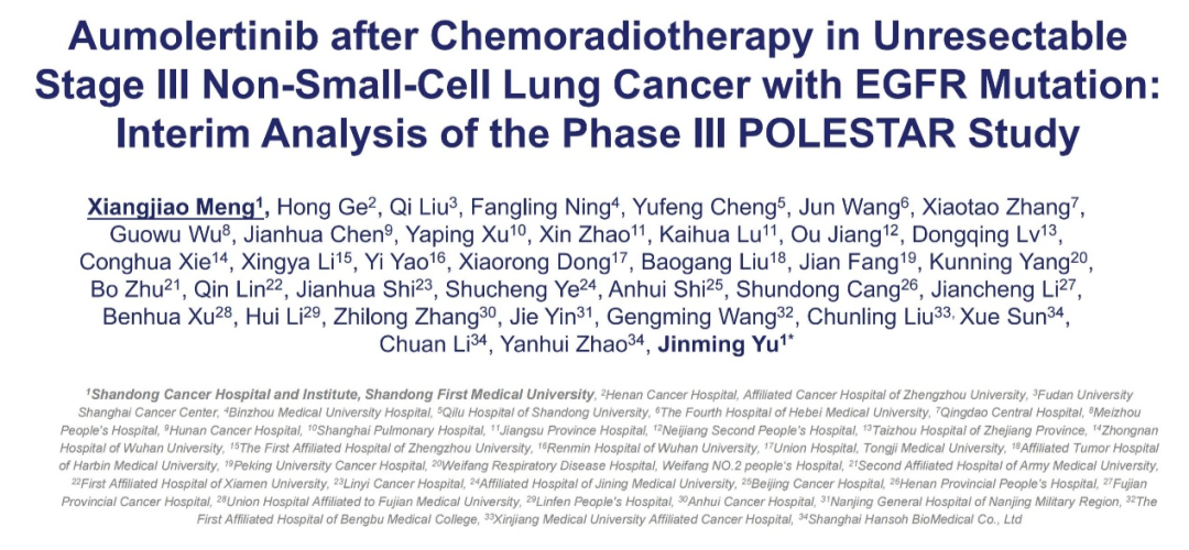 携带EGFR突变的局部晚期、不可手术NSCLC患者,同步放化疗后给予阿美替尼治疗的疗效及安全性:一项III期临床研究的首次期中分析(POLESTAR研究)