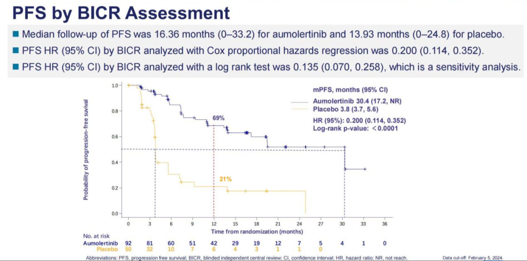 研究纳入III期且不可手术切除的NSCLC患者,患者携带19del或21L858R突变,符合入组标准的患者按2:1的比例随机分为阿美替尼110 mg,口服,每日一次或安慰剂110 mg,口服,每日一次的治疗。主要研究终点为PFS。首次数据分析时,显著性水准为0.01265。