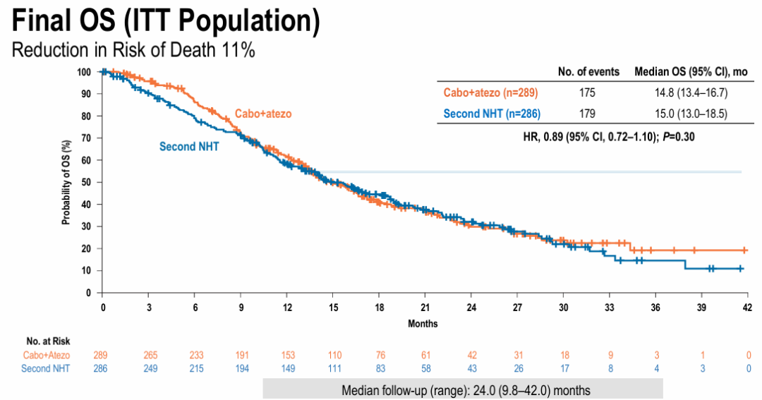 NHT治疗后发生进展的mCRPC患者,预后不良,且疗效有限。ASCO-GU大会公布的CONTACT-02研究数据证实,卡博替尼联合阿替利珠单抗可显著延长NHT治疗进展患者的无进展生存期(HR 0.65;95%CI 0.50~0.84;P=0.0007),已经达到该研究的双主要终点之一PFS。这项研究分析了第二个主要终点OS。