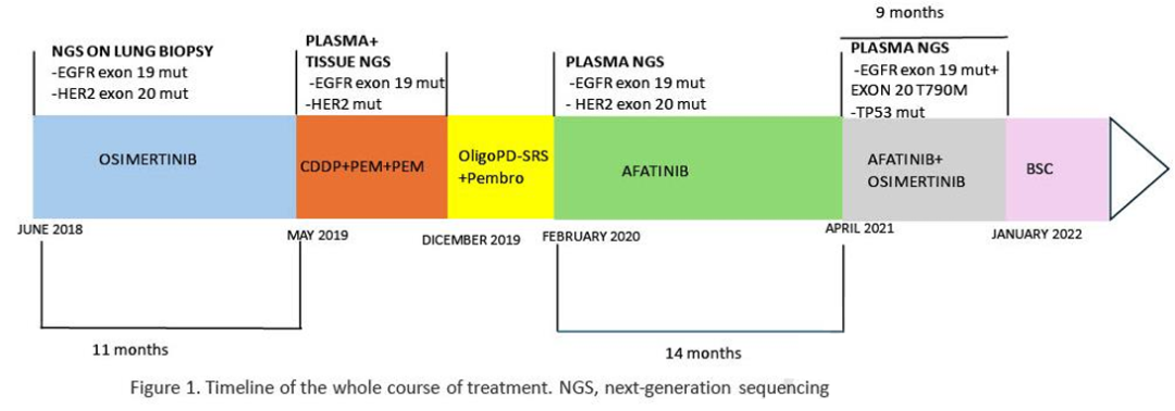 在2021年2月病情进展后,液体活检(LB)显示外显子19 L747P中存在EGFR缺失,以及外显子20 T790M上存在耐药突变,ERBB2基因突变丢失。当时,医生决定添加奥希替尼(40mg OD)并继续使用阿法替尼(30mg OD)。