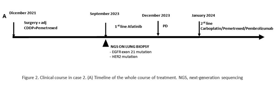 第二位患者是一名47岁的男性,于2021年12月确诊为IIIA期低分化肺腺癌。患者被认为肿瘤可切除,接受了电视辅助胸腔镜手术(VATS)左上肺叶切除术、肿瘤切除和楔形切除,随后进行了4个周期的辅助顺铂/培美曲塞化疗。8个月后,双肺出现疾病复发。通过液体活检进行分子检测,发现外显子21存在EGFR L858R突变,外显子4存在TP53重复(V73RfsX76),G776delins VC突变(这是典型的HER2外显子20缺失-插入)。2023年9月,患者开始使用阿法替尼(40mg OD)治疗转移性疾病。2023年12月疾病进展且液体活检结果阴性,患者接受帕博利珠单抗+培美曲塞-卡铂治疗,随后接受帕博利珠单抗+培美曲塞治疗。治疗仍在进行中,患者对治疗的耐受性良好(图2)。