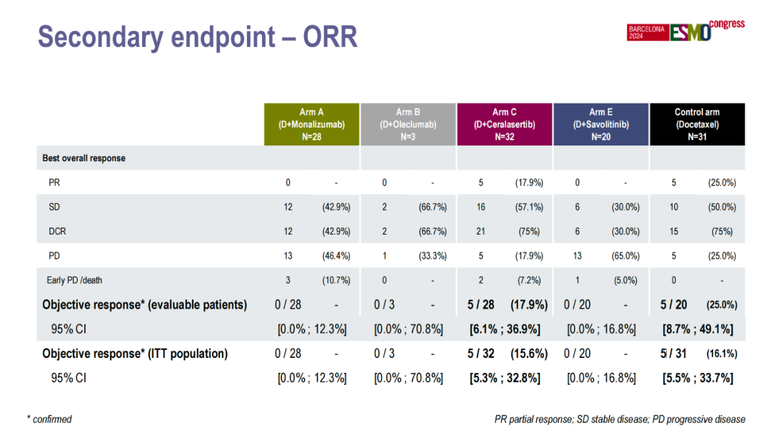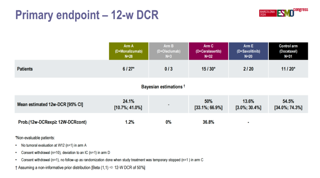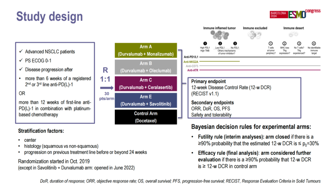 患者随机为4组,A组:度伐利尤单抗(Du)+Monalizumab,B组:Du+Oleclumab,C组:Du+Ceralasertib,E组:Du+赛沃替尼或对照组:多西他赛。