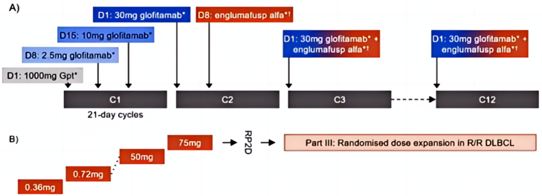 在单剂奥妥珠单抗(Gpt,1000 mg)预处理后,在第1/2周期采用格菲妥单抗阶梯剂量递增给药(2.5/10/30 mg)。1周之后,患者开始接受Englumafusp alfa治疗,自第3周期D1起,每3周接受两种药物治疗。整体治疗期限最长持续12个周期。在剂量递增过程中,采用控制药物过量的连续重评估方法(mCRM EWOC)。同时依据Lugano分期标准对治疗反应率进行评估。