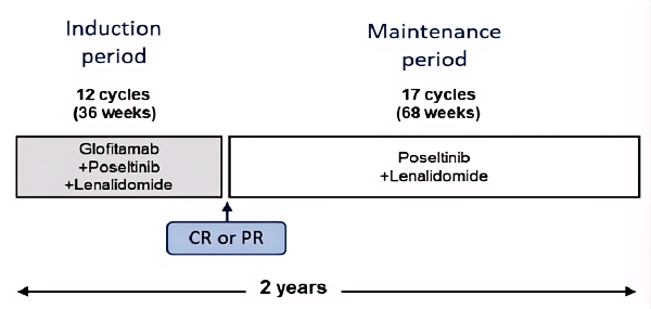 该研究计划招募76例对一线治疗无效或≥2线治疗失败的R/R DLBCL患者。允许患者既往接受过CD19 CAR-T治疗,但排除既往接受过CD20 TCE治疗的患者。所有患者在第1周期中采用格菲妥单抗阶梯剂量递增给药,从2.5 mg递增至10 mg,第2周期D1及以后给予30mg格菲妥单抗。来那度胺(D1-14,20 mg,QD)和poseltinib(D1-21,40 mg,BID)以每3周为1个周期。诱导治疗共12个周期,其后给予poseltinib和来那度胺维持治疗17个周期。主要终点为总缓解率(ORR),次要终点包括缓解持续时间(DoR)、完全缓解率(CRR)、无进展生存期(PFS)、总生存期(OS)和治疗相关不良事件(TEAE)的发生率。