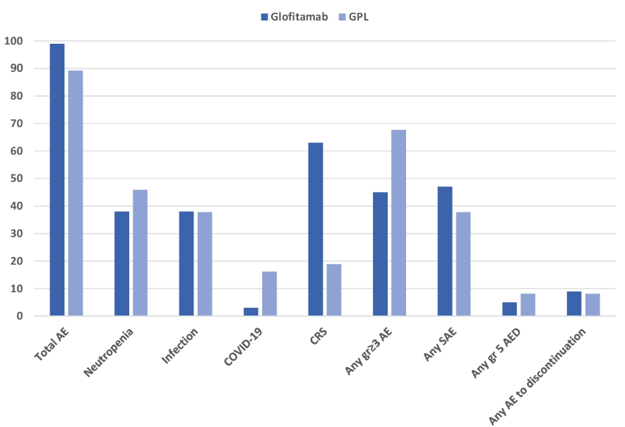 GPL方案的TEAE数据呈现出与格菲妥单抗相似的模式,在安全性队列中未观察到安全性信号(n=6,3+3设计),仅3例患者(8.1%)因TEAE中断了GPL治疗。由于COVID-19感染病例较多,因此中性粒细胞减少(45.9%)和感染(37.8%)是最常见的3/4级TEAE。格菲妥单抗的主要副作用是细胞因子释放综合征(CRS),研究中共7例患者(18.9%)出现CRS,其中仅2例(5.4%)为3/4级。与单独使用格菲妥单抗相比,GPL方案的CRS发生率显著降低。此外,BTKi的副作用亦不容忽视,其中房颤和出血被认为是其最严重的TEAE。而在该项研究中,仅有1例患者出现了此类严重副作用。