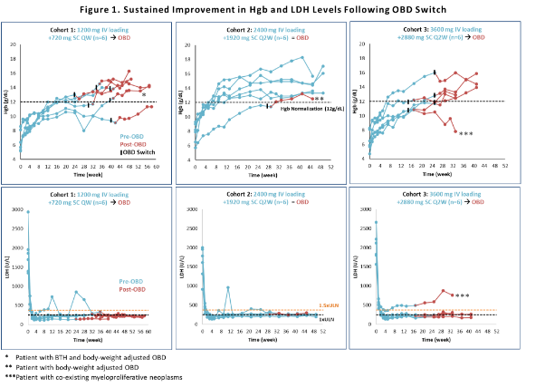 除了第三组中一名合并有骨髓增生性肿瘤(MPN)的患者外,在第24/25周观察到的临床改善在所有患者中都得到了维持和/或进一步增强(图1)。截至数据截止日期,100%(18/18)的患者血红蛋白水平较基线增加≥2 g/dL,平均(SD)血红蛋白水平较基线增加了7.0(2.1)g/dL,88.9%(16/18)的患者达到血红蛋白正常化(≥12 g/dL)。94.4%(17/18)的患者实现LDH<1.5xULN(除MPN患者外),平均(SD)LDH较基线降低84.3(8.7)%。此外,100%(18/18)的患者未出现红细胞输血和94.4%(17/18)的患者未发生突破性溶血(BTH)。