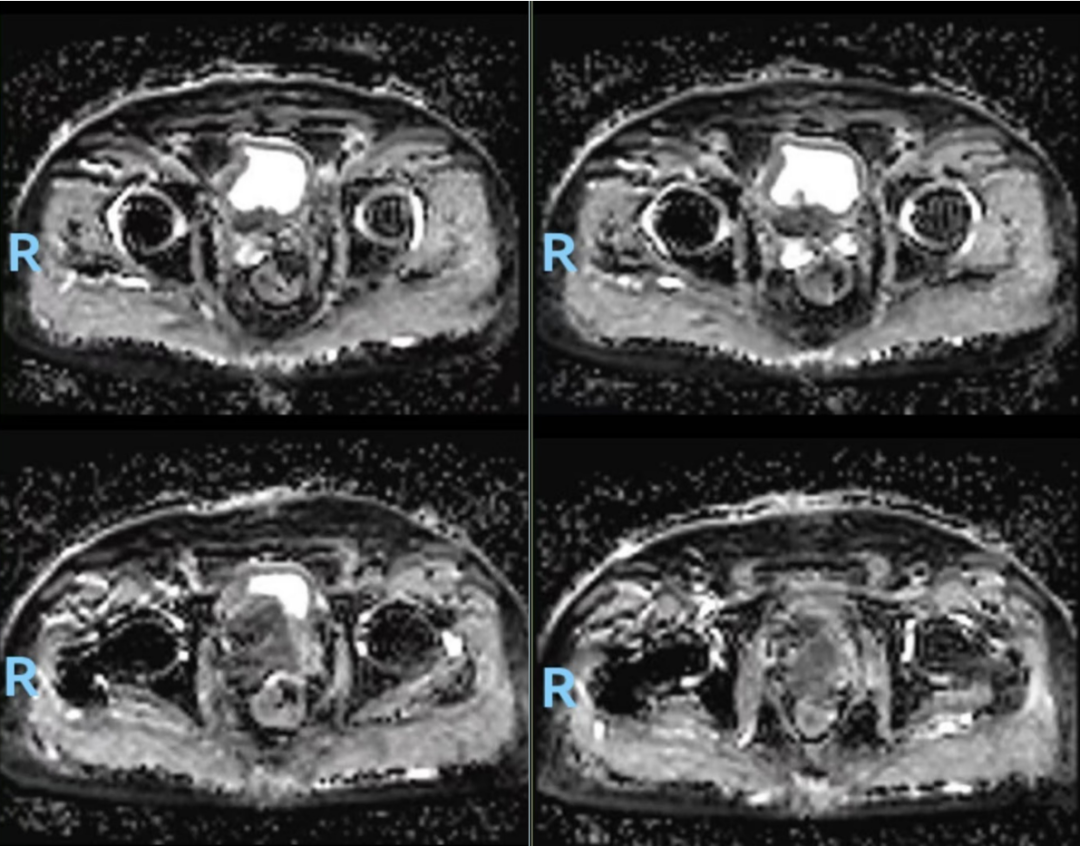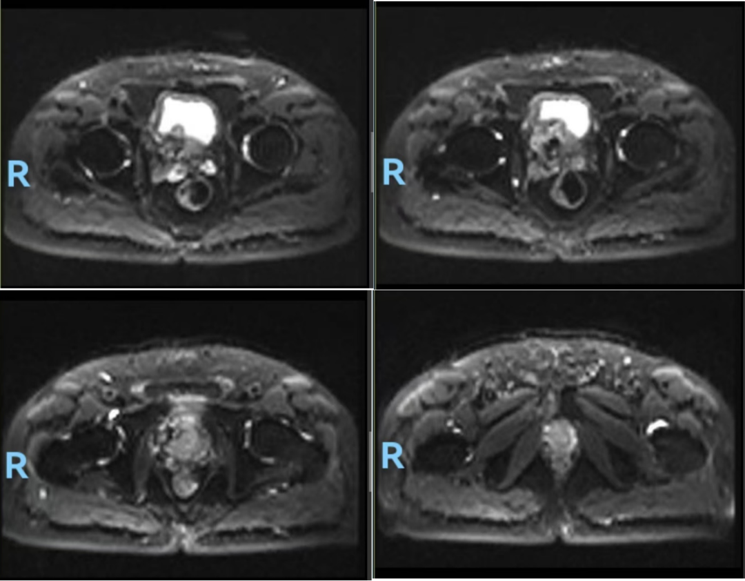 图1.前列腺MR(2024-04-18):前列腺体积不规则增大,约6.2cm(左右)x5.4cm(前后)x7.1cm(上下),中央带、外周带可见不规则片状短T2等T1信号灶,病灶向上突向膀胱,与膀胱后壁及精囊腺分界不清,DWI示病变呈弥散受限高信号,相应ADC信号减低。盆腔内见多个小淋巴结,较大者短径约为0.6cm。双侧耻骨及第1骶骨见稍长T1长T2信号,DWI弥散受限改变。直肠右侧壁局部增厚。诊断:1、考虑前列腺癌,PI-RADS 5,膀胱后壁、双侧精囊腺浸润;2、双侧耻骨及第1骶骨异常信号,转移瘤可能