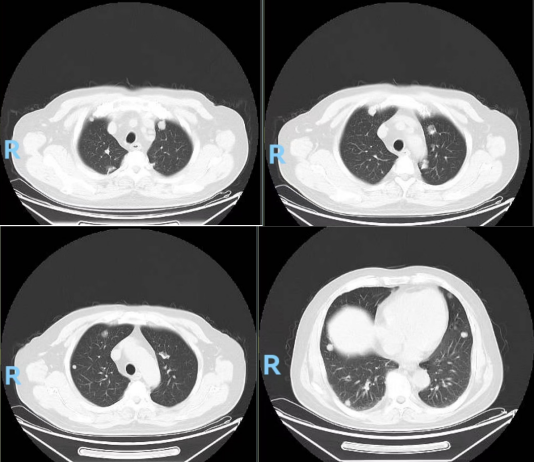 胸部CT(图2,2024-04-18):1.双肺多发结节灶、纵隔、腹膜后多发淋巴结肿大,考虑:肺内多发转移,纵隔淋巴结转移、腹膜后淋巴结转移可能;2.T9椎体骨质破坏,转移可能大。