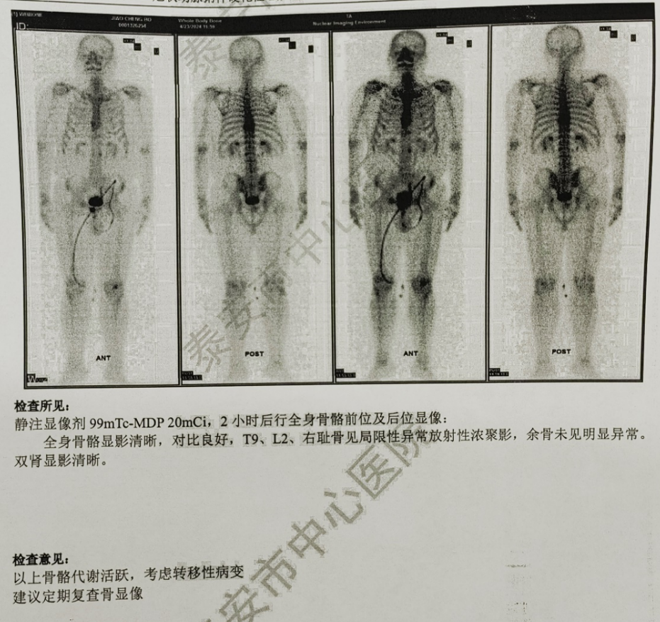 骨扫描(2024-04-18):T9、L2、右耻骨见局限性异常放射性浓聚影,考虑转移性病变。