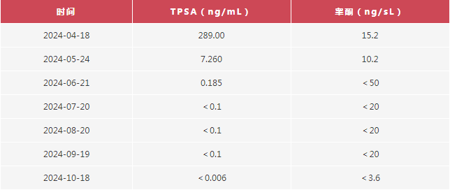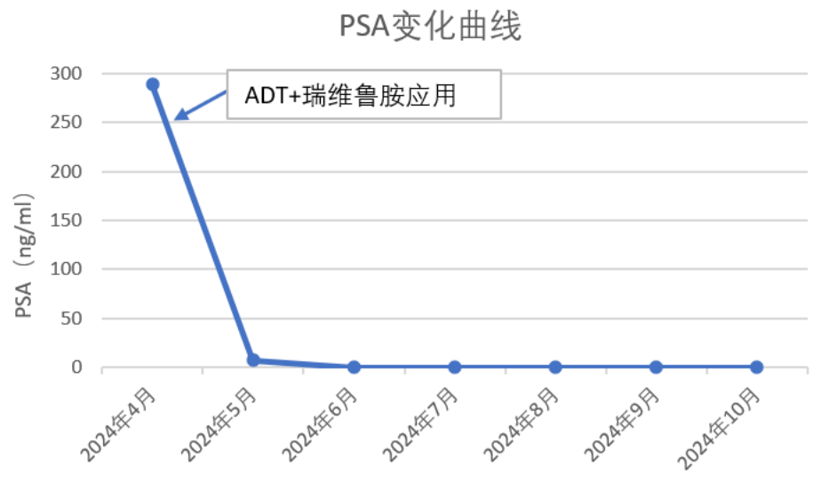 疗效评价:PSA完全缓解(PSA-CR),原发灶肿瘤完全缓解(PR)