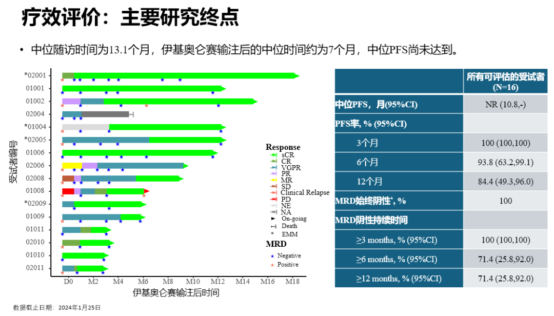 截至2024年1月25日,共有16例受试者接受了伊基奥仑赛的回输治疗。中位随访时间为13.1个月,研究结果显示,所有受试者均达到了MRD阴性,71.4%的受试者在治疗后12个月仍维持MRD阴性状态。中位PFS尚未达到,12个月的PFS率达到了84.4%。客观缓解率(ORR)达到了100%,其中93.8%的受试者达到了严格意义的完全缓解(sCR)。4例EMM受试者均达到sCR,同时10例双打击/三打击的受试者也均达到sCR,83.3%(5/6)的R-ISS为Ⅲ期的受试者达到sCR。这一结果远超现有治疗方法,为高风险新诊断MM患者带来了新的疗效突破。