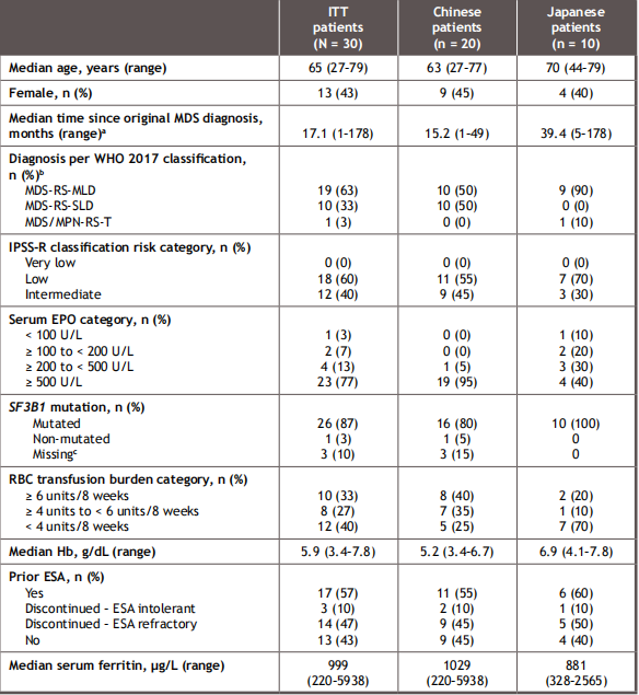 作为MEDALIST的桥接研究,MDS-004研究旨在评估罗特西普在输血依赖的LR-MDS伴环状铁粒幼红细胞(RS)的亚洲(包括中国)患者中的有效性和安全性(P1898)9。常春康教授分享了这两项研究在入组患者的基线特征上存在的区别。首先,中国患者的平均年龄为63岁,相对较年轻,低于MEDALIST研究中的71岁。其次,中国患者的平均Hb水平仅为5.2 g/dL,低于MEDALIST研究中的7.6 g/dL。此外,需要特别关注的是,高达95%的中国患者EPO≥500 U/L,远高于MEDALIST研究中的14%。同时,还有45%的中国患者之前并未接受过ESA治疗(MEDALIST为3%),55%接受过ESA治疗的患者均为ESA难治或耐受性差。这些基线数据揭示了MDS-004研究涵盖的中国患者群体病情更为严重。