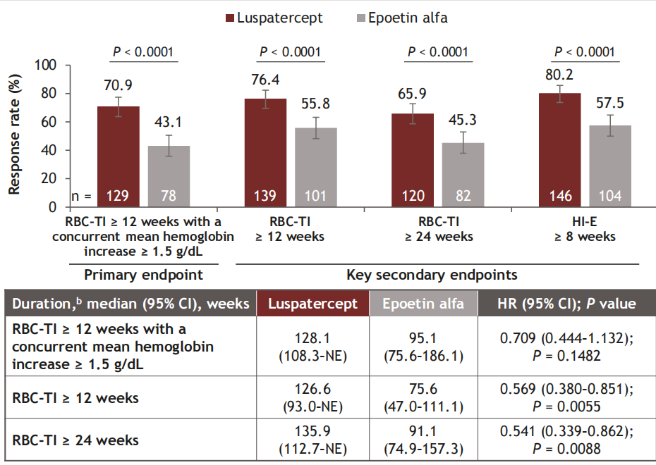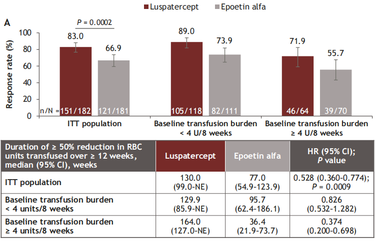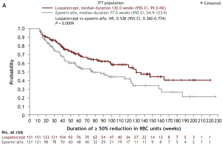 对于主要终点的指标,罗特西普组高达70.9%的患者实现了摆脱红细胞输注(RBC-TI)时长≥12周,并且平均血红蛋白(Hb)增加≥1.5 g/dL,而ESA组仅有43.1%的患者达到此终点(图1)。在次要终点方面,不论是在RBC-TI≥12周、RBC-TI≥24周,还是红系血液学改善(HI-E)≥8周等评估标准上,罗特西普组均显示出更好的获益(图1)。特别值得注意的是,在红细胞输注量减少≥50%并持续≥12周的评估中,罗特西普组的有效率高达83.0%,显著优于ESA组的66.9%(图2)。此外,罗特西普组RBC-TI≥12周的中位应答持续时间长达126.6周,比ESA组(75.6周)长近1年(P=0.0055)。这些结果有力证明了罗特西普治疗能显著并持续地延迟和减少输血需求。