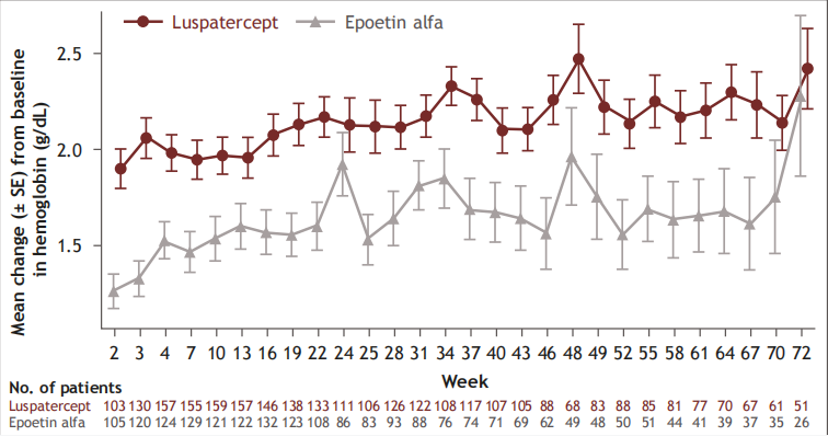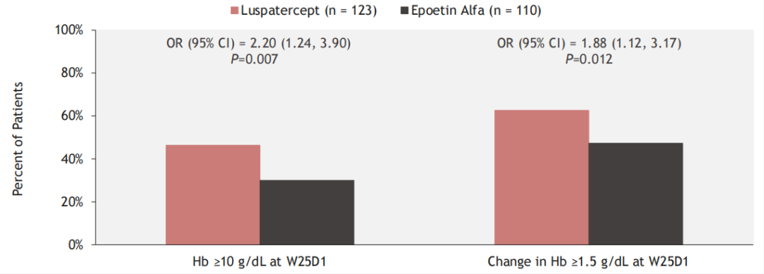 图5.在意向治疗(ITT)人群中,两组在第25周第1天的Hb水平