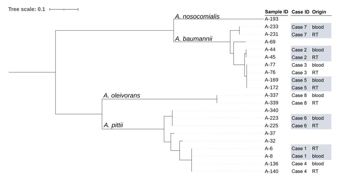 在这次EHA大会上,我们汇报的一项研究[2],分析了46例血液病患者。这些患者中,有39.1%(n=18)既往存在不动杆菌属定植。在定植的患者中,发生CRA血流感染(BSI)的比例显著高于非定植患者(72.2%vs 17.9%,P<0.001),炎性标志物水平和30天死亡率(78.6%vs.50%)也更高。值得注意的是,我们发现8例有呼吸道定植菌株和血流感染CRA呼吸道分离株相关样本检测匹配的患者中,二代测序显示其基因组学具有同源性,通过基于多位点序列分型(MLST)和单核苷酸多态性(SNP)的系统发育树发现,这些患者的血流感染CRA均来源于呼吸道定植菌株。这些结果表明,血液病患者的血流感染CRA和定植菌具有较高的同源性,临床上一旦筛查出此类定植菌,并且发生粒缺伴发热需警惕CRA感染,并且可以参考定植菌的药敏结果来选择恰当的抗菌药作为初始经验性治疗;另一方面则是要通过院感手段,减少血液病患者的耐药细菌定植。