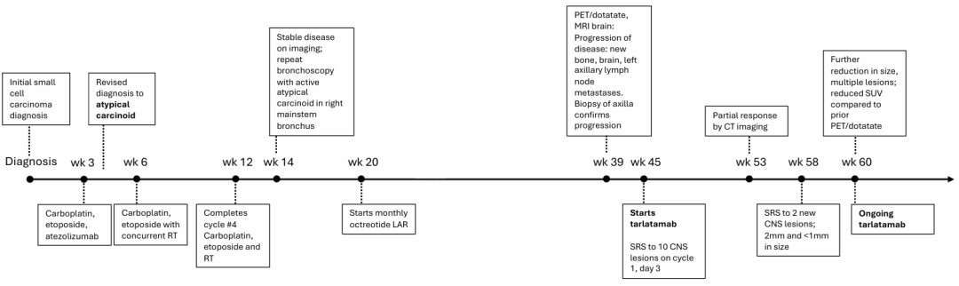 肺类癌是肺神经内分泌肿瘤的一种罕见亚型,约占成人肺恶性肿瘤的1-2%。根据有丝分裂计数和有无坏死,肿瘤被分为“典型类癌”(低级别)或“非典型类癌”(中级别)。典型类癌通常惰性生长,转移发生率不高,而非典型类癌可能更具侵袭性,肿瘤生长和播散更快。对于被诊断为转移性肺类癌的患者,指南推荐的治疗方案很少,而且通常治疗缓解率较低[1,2,3]。DLL3表达通常见于高级别神经内分泌癌,例如小细胞肺癌(SCLC),但DLL3表达也发生于30%-40%的肺类癌[4]。因此,新型DLL3靶向药为SCLC以外的肺神经内分泌癌患者的有效治疗带来了新希望。例如,研究显示obrixtamig(DLL3靶向T细胞接合剂)治疗10名大细胞神经内分泌癌患者,其中7名产生客观缓解[5]。本文报告一例对多种疗法均耐药的转移性非典型类癌病例,其肿瘤强烈表达DLL3,并对Tarlatamab治疗产生强烈的临床反应。