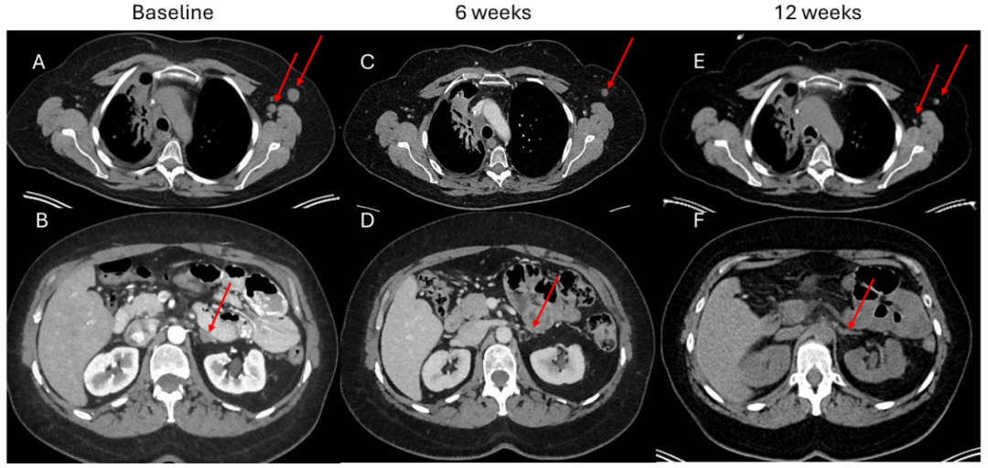 在Tarlatamab治疗第1周期第3天,针对脑转移瘤接受了立体定向放射外科(SRS)治疗。Tarlatamab治疗6周后CT显示产生治疗反应,左腋窝淋巴结从1.5 cm缩小到0.9 cm,左肾上腺结节从1.3 cm缩小到0.5 cm(图3,A-D)。先前放疗的右侧气管旁肿块从2.4 cm缩小到1.9 cm,隆突下淋巴结从1.6 cm缩小到1.1 cm。第12周的PET/Dotatate成像(图3E-F)显示右肺门肿块、左肾上腺结节和左腋窝淋巴结进一步减小。右侧气管旁的标准摄取值(SUV)从基线6.4降至4.7,左腋窝从2.2降至1.3,左额颅骨病变从2.4降至1.2。不幸的是,脑部MRI发现了两个非常小的新病变,采用SRS治疗第二疗程,并继续使用Tarlatamab。在前四个疗程的Tarlatamab治疗中,没有发生细胞因子释放综合征(CRS)或免疫效应细胞相关神经毒性综合征(ICANS)。第1疗程期间出现了1级疲劳,现已缓解,1级味觉障碍一直持续存在。