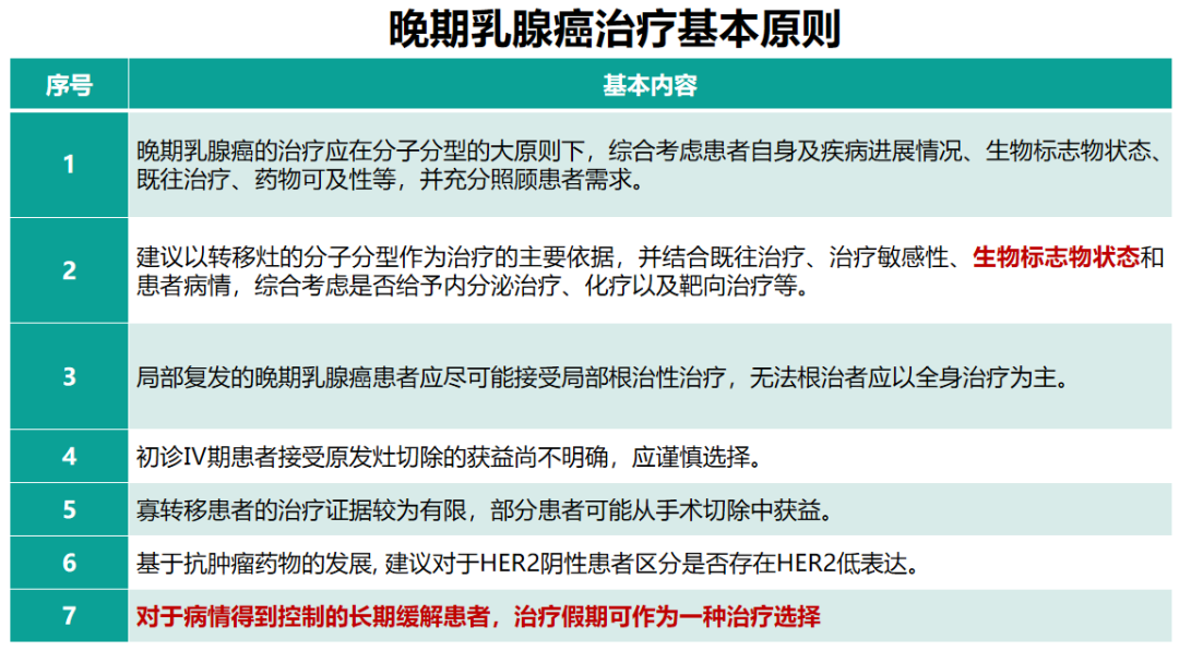 晚期乳腺癌治疗基本原则主要有2方面更新,一是强调在相关靶向药物临床可及的情况下,建议明确ESR1、PIK3CA、AKT、PTEN、PD-L1、gBRCA、MSI和TMB等生物标志物,以指导治疗;二是结合ABC7,新增长期缓解乳腺癌治疗建议,将“治疗假期”作为一种治疗选择,但具体的长期缓解时间及“治疗假期”时间尚无证据,需个体化决策并定期复查。