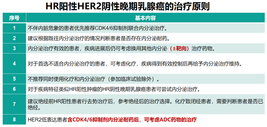 二线及后线治疗的更新更为丰富,对于CDK4/6i经治患者,基于DB-04、DB-06研究优先推荐携带HER2低表达患者选择T-DXd治疗;基于CAPItello-291研究推荐氟维司群+卡匹色替(针对携带PIK3CA/AKT2/PTEN任意突变的患者),基于TROPiCS-02研究推荐戈沙妥珠单抗;此外,基于TROPION-breast 01、EMERALD等研究,Dato-DXd、Elacestrant(针对ESR1突变患者)也是可选方案。