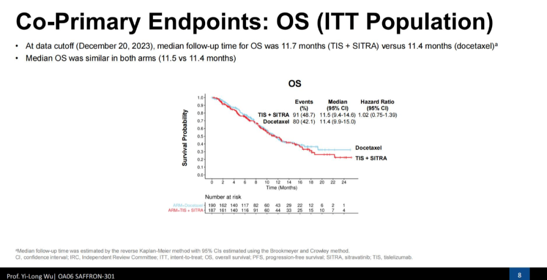 最终,联合治疗组和多西他赛组分别入组187例和190例患者,PD-L1>1%的患者占比分别为36.4%和36.8%。独立评审委员会评估的中位PFS分别为4.4个月和2.9个月,HR=0.82。研究者评估的中位PFS分别为4.4个月和2.9个月,HR=0.64,两组中位OS分别为11.5个月和11.4个月,HR=1.02。亚组分析未发现潜在获益人群,两组ORR分别为12.3%和12.6%,DCR分别为69.5%和53.7%,3度以上全因不良反应发生率分别为65.1%和56.5%,严重不良反应发生率分别为44.6%和37.3%。