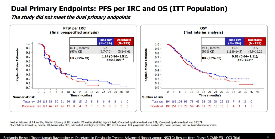 CEACAM5广泛表达于肿瘤细胞表面,Tusamitamab是针对该靶点的抗体偶联药物,其偶联的细胞毒类药物为DM4。该研究纳入非鳞、非小细胞肺癌患者,既往接受化疗或免疫检查点抑制剂耐药后出现疾病进展,CEACAM5表达定义为在超过50%的细胞中表达超过2+。符合入组标准的患者按1:1的比例随机分为多西他赛75 mg/m2,每3周一次或Tusamitamab 100 mg/m2,每两周一次。主要研究终点为独立评审委员会评估的PFS和OS。