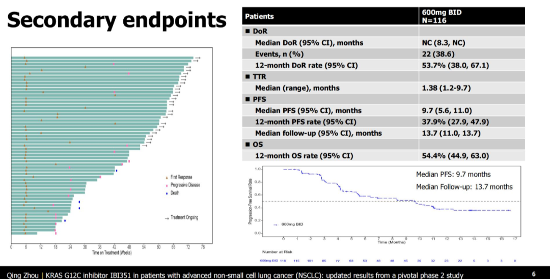 D1553是一款针对KRAS G12C突变的非小细胞肺癌患者,该研究前期数据显示,该药后线治疗KRAS G12C突变的非小细胞肺癌患者展示了良好的抗肿瘤活性。本次公布了其长期随访数据。研究纳入免疫检查点抑制剂及含铂双药治疗后耐药的晚期非小细胞肺癌患者,患者携带KRAS G12C突变,符合入组标准的患者给予D1553 600 mg,口服,每日两次治疗,主要研究终点为独立评审委员会评估的ORR。研究共入组123例患者,数据截止日期时,22%的患者仍接受治疗,中位随访时间12.3个月。