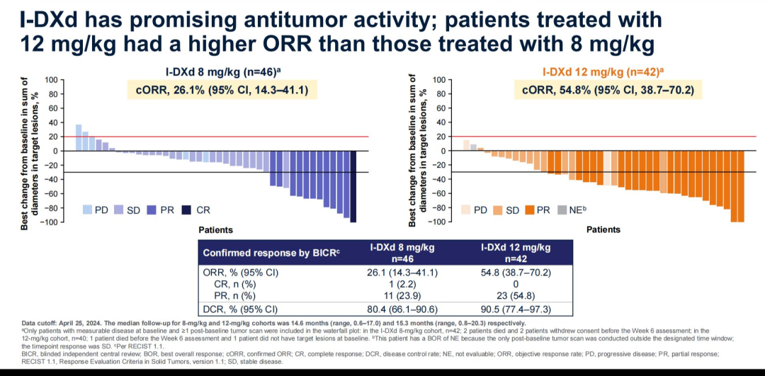 最终8mg/kg组和12mg/kg组分别入组46例和42例患者,两组分别有41.3%和42.9%的患者基线有脑转移。既往接受过免疫检查点抑制剂治疗的患者,占比分别为76.1%和76.2%,两组ORR分别为26.1%和54.8%,并分别有2.2%和0%的患者评估为CR,中位至响应出现时间均为1.4个月,中位DOR分别为7.9个月和4.2个月,中位PFS分别为4.2个月和5.5个月,中位OS分别为9.4个月和11.8个月,两组分别有6例和10例患者基线有脑转移,颅内ORR分别为66.7%和50.0%。3度以上全因不良反应发生率分别为43.5%和50%,并分别导致6.5%和16.7%的患者治疗终止,21.7%和35.7%的患者治疗延迟,8.7%和14.3%的患者剂量降低,较常见的不良反应为胃肠道毒性和血液学毒性。