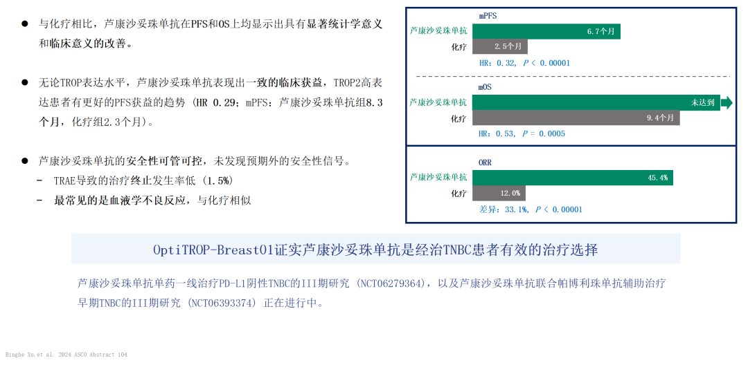 热烈祝贺佳泰莱®(SKB264/芦康沙妥珠单抗)正式获批上市,将为中国晚期三阴性乳腺癌患者的治疗带来全新的治疗体验。III期临床试验OptiTROP-Breast01的研究结果表明,这款首个中国原创的TROP2 ADC药物,凭借创新的药物分子结构设计和独特的作用机制,相较于传统化疗,不仅显著改善了患者的生存获益,同时提高了治疗的安全性。该研究入组的都是中国患者,针对性更强,数据更充分,是中国晚期三阴性乳腺癌患者有效、安全的治疗选择。