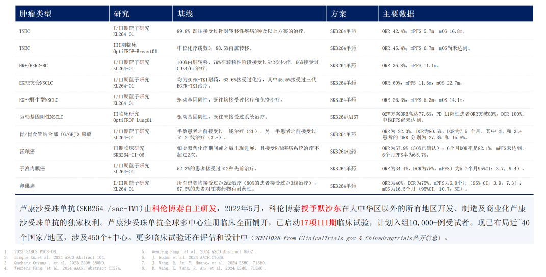 对于HR+/HER2-mBC芦康沙妥珠单抗同样表现抢眼,2023年ESMO大会,公布了其用于经过多线治疗的HR+/HER2-mBC的初步结果(数据来自KL264-01篮子研究),疗效令人欣喜,ORR高达36.8%,mPFS长达11.1个月;同时,整体安全性可管可控,最常见的是血液学不良反应。不仅如此,2024年8月19日,芦康沙妥珠单抗用于治疗经EGFR-TKI和含铂化疗治疗失败的EGFR突变局部晚期或转移性非小细胞肺癌(NSCLC)的新药申请(NDA)获国家药品监督管理局(NMPA)药品审评中心(CDE)受理,并纳入优先审评。同年10月31日,芦康沙妥珠单抗用于治疗EGFR-TKI治疗进展的EGFR突变局部晚期或转移性NSCLC的新药申请获CDE受理并纳入优先审评。未来随着两项适应症的获批,芦康沙妥珠单抗有望改变EGFR-TKI耐药后晚期NSCLC患者治疗格局。同时,芦康沙妥珠单抗在妇科肿瘤和消化道肿瘤也相继取得了出色的成果。芦康沙妥珠单抗展现出了同类最佳的潜质,立足于临床巨大的未被满足的治疗需求,科伦博泰携手默沙东已注册开展了17项III期临床试验(20241028 from ClinicalTrials.gov&Chinadrugtrials公开信息),探索芦康沙妥珠单抗在不同肿瘤、不同疾病阶段、不同治疗策略的疗效和安全性。随着临床试验项目不断地加码和加速,芦康沙妥珠单抗有望从「冲锋舟」化身「航空母舰」。芦康沙妥珠单抗作为中国创新药出海的代表,也将成TROP2 ADC的重要代表药物。