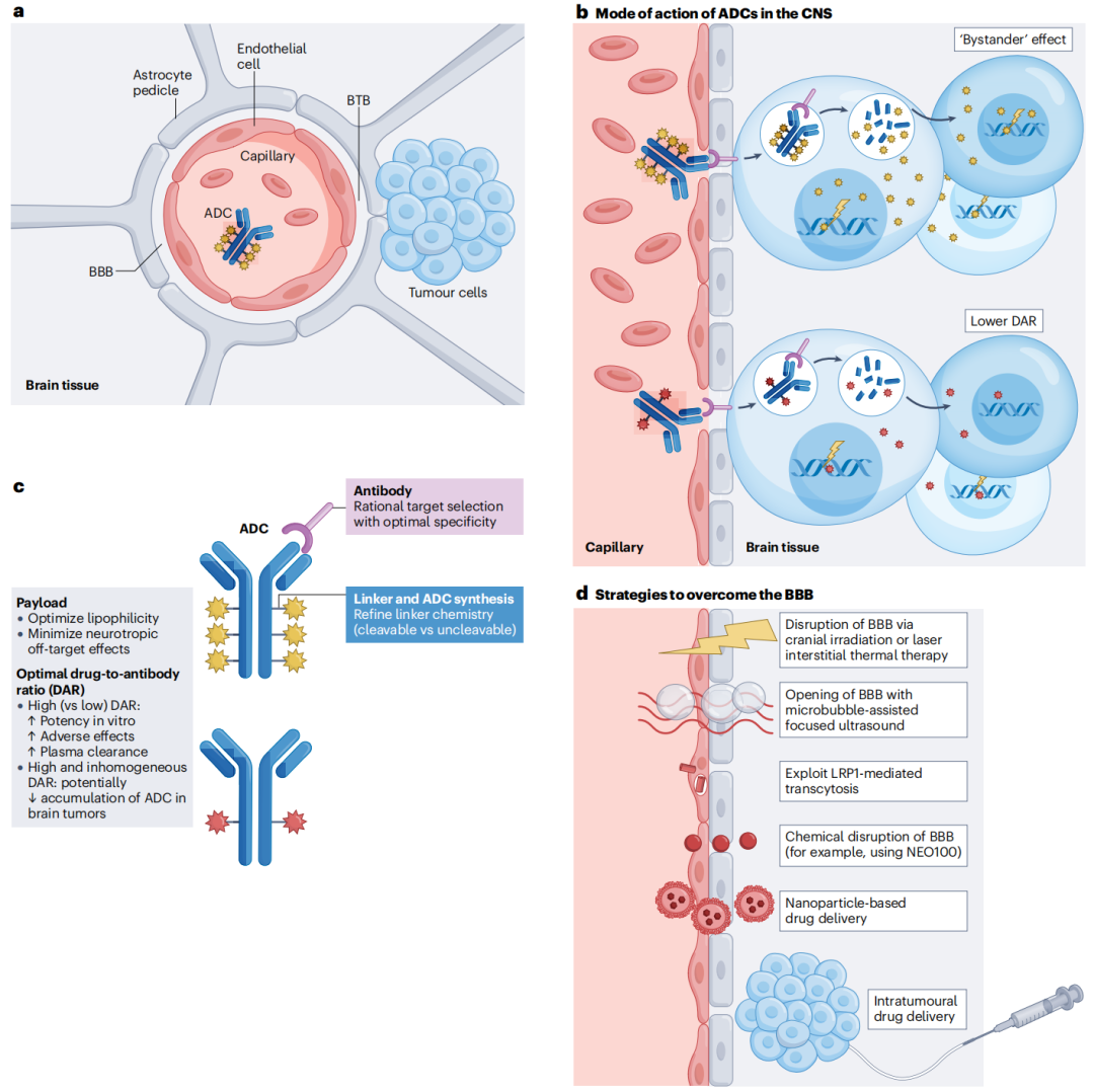 图1.影响ADCs在中枢神经系统中递送和活性的参数。a.血脑屏障(BBB),由紧密连接的毛细血管内皮细胞以及可以收缩的星形胶质细胞足突组成,这些在异常的“血肿瘤屏障”(BTB)中可能会收缩。b.ADCs与肿瘤细胞相关表位结合,随后内化,在溶酶体中降解并释放细胞毒素有效载荷。释放的有效载荷可以根据其亲脂性扩散到邻近的不表达抗体靶表位的细胞,产生“旁观者效应”。高药物抗体比例(DAR)与低DAR对有效载荷浓度和扩散的影响。c.ADC组分的分子特性决定其在颅内的效力和耐受性。d.旨在克服BBB和/或BTB的物理、化学和分子方法,从而增加包括ADC在内的药物在颅内的递送