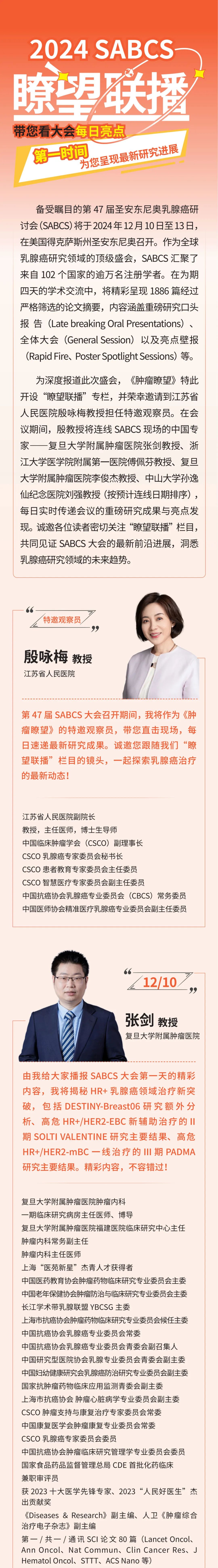 为深度报道此次盛会,《肿瘤瞭望》特此开设“瞭望联播”专栏,并荣幸邀请到江苏省人民医院殷咏梅教授担任特邀观察员。在会议期间,殷教授将连线SABCS现场的中国专家——复旦大学附属肿瘤医院张剑教授、浙江大学医学院附属第一医院傅佩芬教授、复旦大学附属肿瘤医院李俊杰教授、中山大学孙逸仙纪念医院刘强教授(按预计连线日期排序),每日实时传递会议的重磅研究成果与亮点发现。诚邀各位读者密切关注“瞭望联播”和《肿瘤瞭望》推出的栏目,共同见证SABCS大会的最新前沿进展,洞悉乳腺癌研究领域的未来趋势!