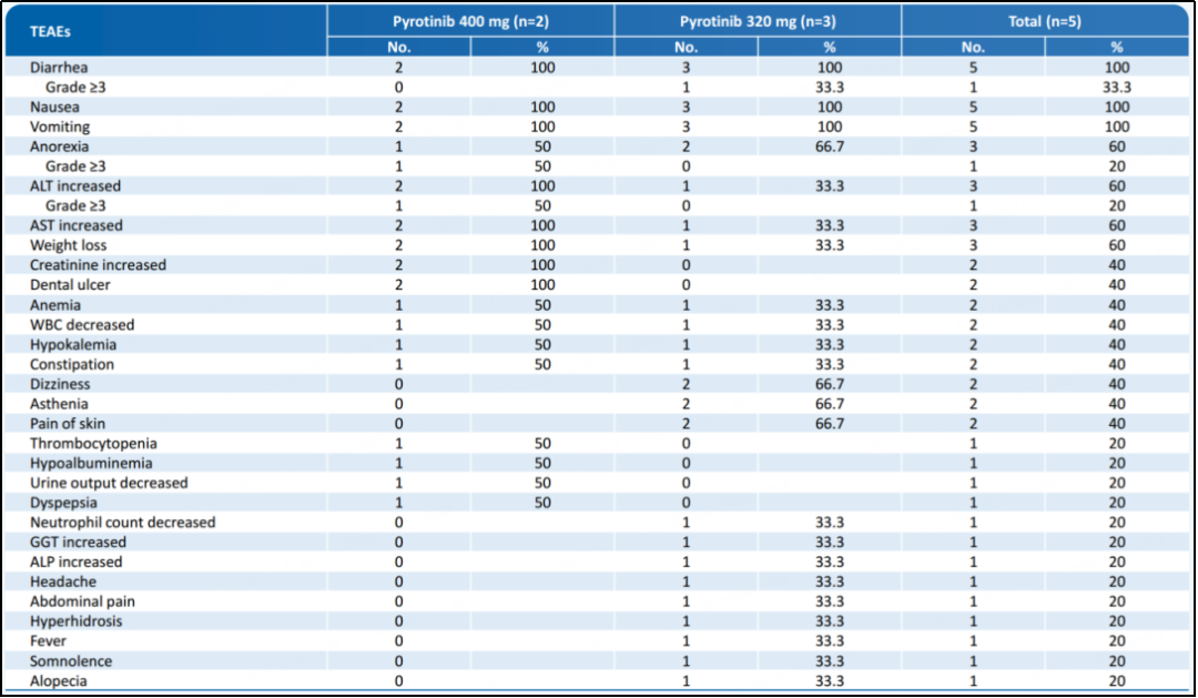 安全性分析显示,最常见的治疗期间不良事件(TEAEs)包括腹泻(100%,5/5)、恶心(100%,5/5)、呕吐(100%,5/5)、厌食(60%,3/5)、丙氨酸氨基转移酶(ALT)升高(60%,3/5)、天冬氨酸氨基转移酶(AST)升高(60%,3/5)以及体重下降(60%,3/5)等。3级TEAEs包括1例厌食和ALT升高(400mg吡咯替尼组)以及1例腹泻(320mg吡咯替尼组)。未观察到4级或5级TEAEs。所有4例肿瘤可评估的患者均实现部分缓解(PR)。
