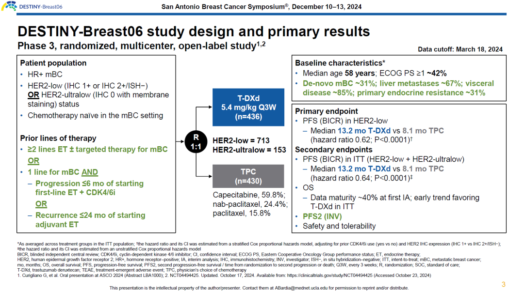 DESTINY-Breast06研究的额外分析是此次SABCS最重磅的报告之一。在今年美国临床肿瘤学会(ASCO)年会、欧洲肿瘤内科学会(ESMO)年会相继报道了DESTINY-Breast06研究的整体数据、生活质量、活检结果影响等数据之后,本次SABCS在此基础上进一步的结果呈现令人倍加关注。
