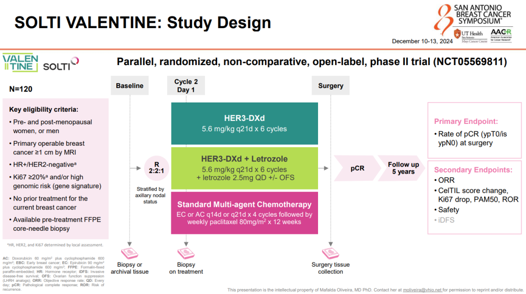 SOLTI VALENTINE研究同样非常值得关注。该研究主要针对可手术的II-III期高危(Ki67≥20%和/或携带高复发风险基因组)HR+/HER2-早期乳腺患者,按2:2:1的比例随机分为HER3-DXd组、HER3-DXd+ET±卵巢功能抑制(OFS)组和化疗组(AC/EC-T)进行新辅助治疗。主要终点是手术时的病理完全缓解(pCR,ypT0/is ypN0)率;次要终点包括残留肿瘤负荷(RCB)、ORR、CelTIL评分变化等。
