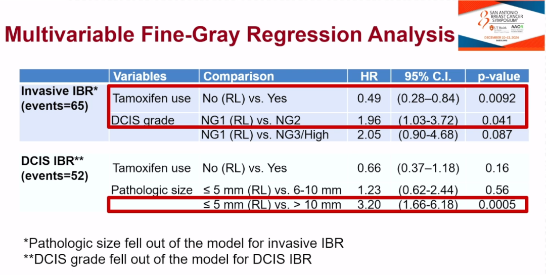 在单变量分析中,病理大小(≤5mm vs.>10mm)与IBR显著相关(P=0.0001),DCIS分级(1级vs 2级)也与IBR显著相关(P=0.042)。在IBR的多变量分析中,DCIS分级未纳入模型,在调整病理大小后,他莫昔芬的使用仍与IBR减少具有统计学显著相关性。在浸润性IBR的多变量分析中,大小未纳入模型,在调整分级后,他莫昔芬的使用仍与浸润性IBR减少具有统计学显著相关性。与未使用他莫昔芬的患者相比,使用他莫昔芬的患者发生任何IBR的可能性降低了44%(HR=0.56,95%CI:0.38,0.84;P=0.0044),发生浸润性IBR的可能性降低了51%(HR=0.49,95%CI:0.28,0.84;P=0.0092)。