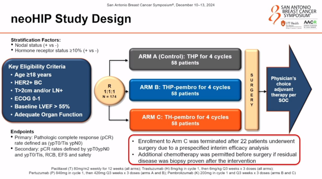 neoHIP是一项针对早期HER2阳性乳腺癌的、多中心、2期、开放标签的临床试验,探索了新辅助(A组)THP vs(B组)THP-帕博利珠单抗vs(C组)TH-帕博利珠单抗的疗效和安全性。该研究入组了年龄≥18岁、未经治疗的II-III期HER2+乳腺癌患者,并根据临床淋巴结状态(阳性或阴性)和激素受体状态(阳性或阴性)进行随机分层。主要终点是pCR;ypT0/Tis ypN0)。次要终点包括根据ypT0ypN0和ypT0/Tis定义的pCR率、RCB、EFS和安全性。