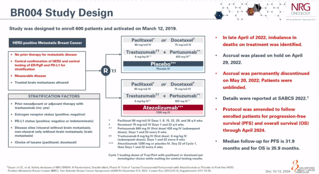 NRG-BR004研究是一项针对HER2阳性晚期乳腺癌患者一线治疗的临床试验。当前,紫杉醇类联合曲帕双靶(THP方案)作为标准治疗方案,在HER2阳性晚期乳腺癌的治疗中发挥着关键作用。然而,NRG-BR004研究试图在这一基础上进一步探索免疫治疗的潜力,特别是阿替利珠单抗的加入是否能为患者带来额外的获益。