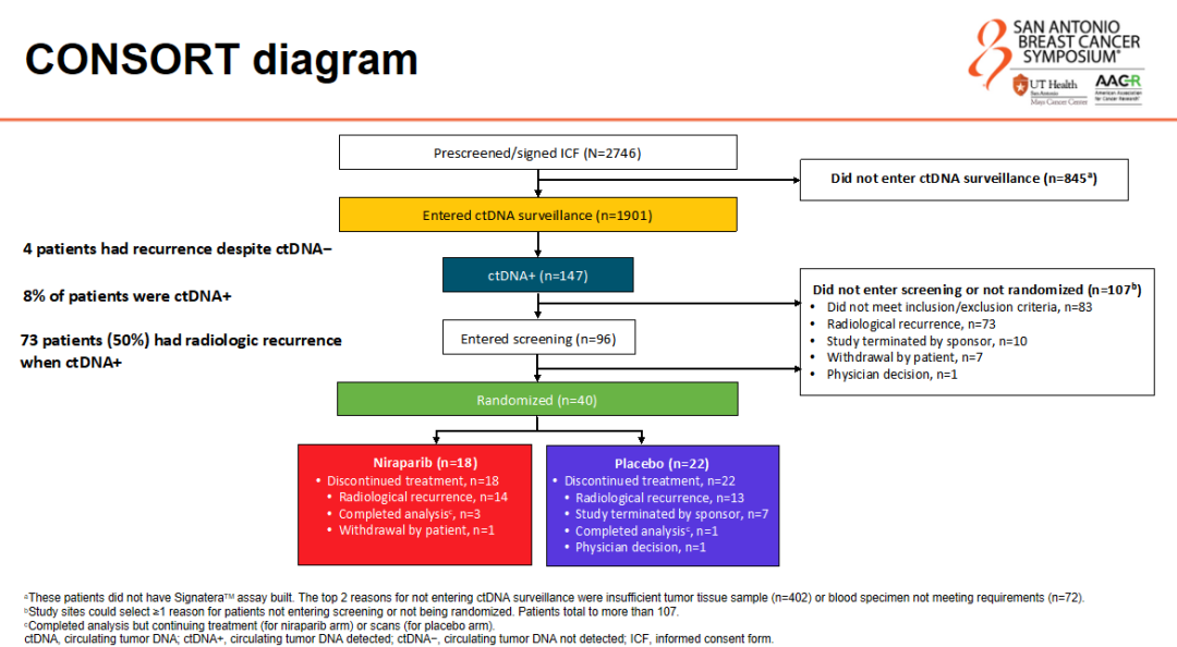 我首先要介绍的研究是——ZEST研究(摘要编号:GS3-01)。ZEST(NCT04915755)是首个针对乳腺癌开展的最小残留病灶(MRD)导向治疗的3期、随机、双盲临床试验,旨在评估已完成治疗且ctDNA阳性、无影像学复发的患者中,尼拉帕利(niraparib)的强化治疗是否能改善无病生存期(DFS)。遗憾的是,ZEST研究最终未能达到预期目标,研究提前终止。