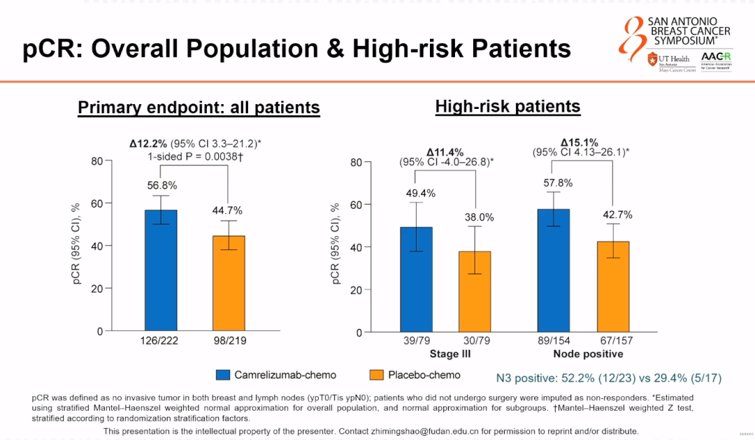 共有441例患者被随机分组并接受治疗(卡瑞利珠单抗组:n=222;安慰剂组:n=219)。中位随访时间为14.4个月。结果显示,卡瑞利珠单抗联合化疗组的pCR率为56.8%(95%CI:50.0~63.4),安慰剂联合化疗组为44.7%(95%CI:38.0~51.6)(差异率:12.2%;95%CI:3.3~21.2;单侧P=0.0038)。无论PD-L1表达、淋巴结状态或基线疾病分期如何,卡瑞利珠单抗联合化疗均可观察到pCR的获益。