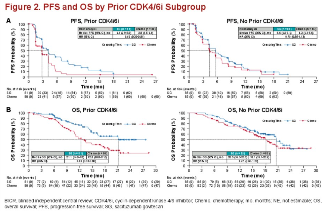 EVER-132-002的研究设计贴近亚洲临床实践,对CDK4/6抑制剂(CDK4/6i)是否经治未做限定,由于CDK4/6i经治与否可能会对患者的预后产生影响,因此,徐兵河院士进一步对EVER-132-002研究进行亚组分析,并在此次SABCS上公布了数据。亚组分析结果显示,对于CDK4/6i经治患者,SG较TPC改善了PFS,降低了44%的疾病进展或死亡风险(HR,0.56,95%CI:0.39-0.81),也改善了OS,降低了50%的死亡风险(HR,0.50,95%CI 0.31-0.80);对于CDK4/6i未经治患者,SG较TPC也在一定程度上改善了PFS和OS(图4)[6]。
