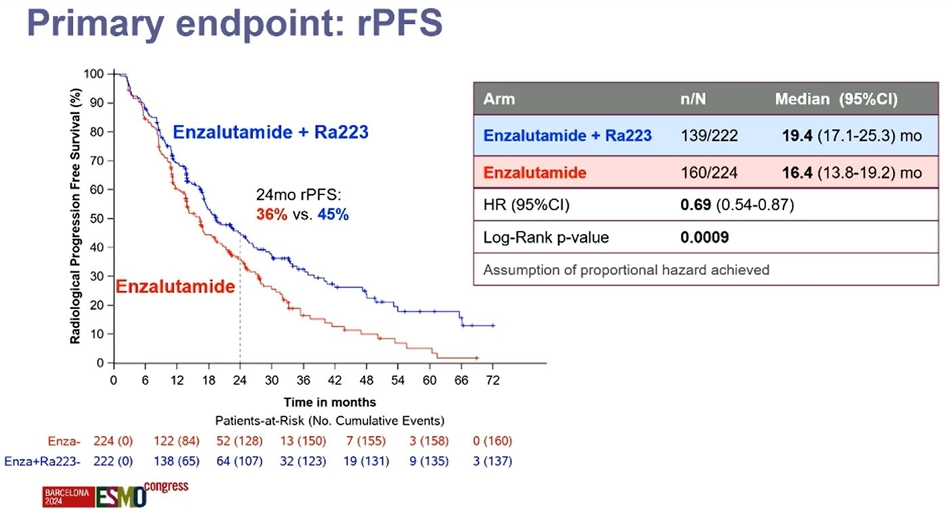 [1]Silke Gillessen,et al.A randomized multicenter open label phase III trial comparing enzalutamide vs a combination of Radium-223(Ra223)and enzalutamide in asymptomatic or mildly symptomatic patients with bone metastatic castration-resistant prostate cancer(mCRPC):First results of EORTC-GUCG 1333/PEACE-3.ESMO 2024;LBA1