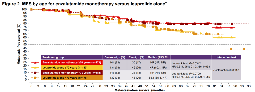 EMBARK研究对BCR治疗模式的探索很有借鉴意义,既往报道对于治疗36周达到PSA小于0.2ng/ml的患者,即可以停止治疗,这种模式不仅没有减少疗效获益,而且可以改善患者生活质量。此次ESMO报道了不同年龄人群的事后分析[7]显示,该治疗方案对老年人也非常“友好”。首先对于≥70岁的患者(HR 0.495),与<70岁的患者(HR 0.368),恩扎卢胺联合治疗均可相较于ADT改善患者MFS。当然,≥70岁老年患者的严重不良事件要高于<70岁患者(45.0%vs 25.3%)。对于不耐受联合治疗的老年患者,可以考虑接受恩扎卢胺单药治疗,而这两个年龄人群接受单药治疗(≥70岁:HR 0.611;<70岁:HR 0.671)同样均有MFS改善。