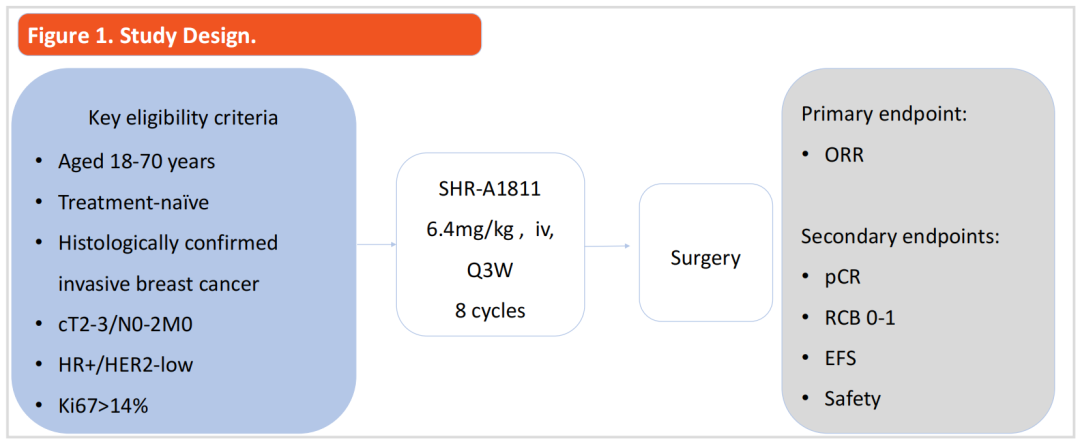 这是一项基于Simon两阶段设计的开放标签、单臂II期临床试验。共需招募66例患者,第一阶段入组35例患者。如果有18例或更多患者有治疗反应,试验将进入第二阶段,额外招募31例患者。主要入组标准包括:年龄18-70岁,未接受过治疗,组织学确诊的浸润性乳腺癌,临床分期T2-3/N0-2M0,HR+/HER2低表达和Ki-67>14%。符合条件的患者接受SHR-A1811(6.4 mg/kg静脉注射,每21天)共8个周期的治疗。主要研究终点是客观缓解率(ORR);次要研究终点包括安全性、残余肿瘤负荷(RCB)0-1、pCR、无事件生存(EFS)。