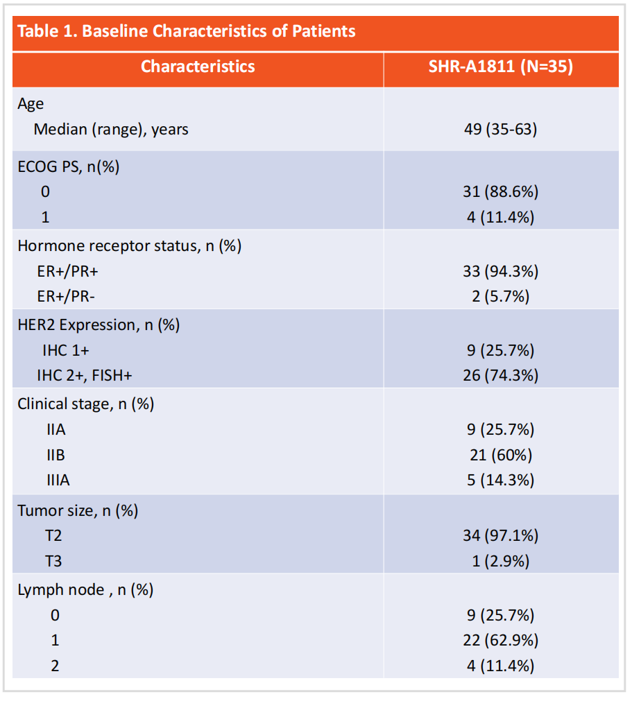 截至2024年6月17日,第一阶段的35例患者中有34例成功接受了研究方案并按计划完成了手术。所有入组人群中,74.3%(26/35)的患者为淋巴结阳性,85.7%(30/35)的患者为IIA/IIB期,14.3%(5/35)的患者为IIIA期,74.3%(26/35)的患者基线HER2表达为IHC 2+,25.7%(9/35)为IHC 1+。