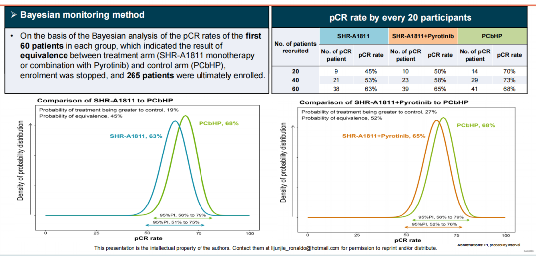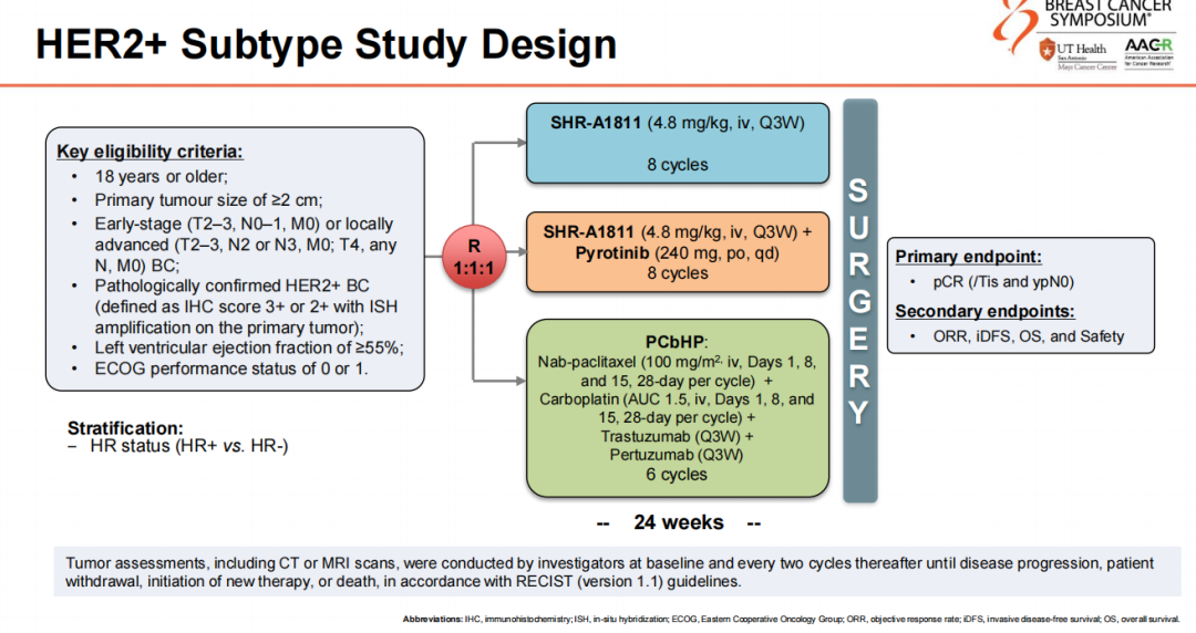 在此项研究设计时,我们设置了三个治疗组:A组为SHR-A1811(4.8mg/kg,Q3W)单药治疗,B组为SHR-A1811(4.8mg/kg,Q3W)联合吡咯替尼治疗,C组(对照组)为当前疗效最强的HER2阳性乳腺癌新辅助治疗方案——白蛋白紫杉醇联合卡铂联合曲妥珠单抗联合帕妥珠单抗。我们希望通过对比,评估新一代ADC的疗效,并探索ADC+方案的效果。在B组中,我们选择了较低的吡咯替尼剂量(240mg),以减轻可能带来的毒副作用。这是对这三个治疗臂设计的考量。