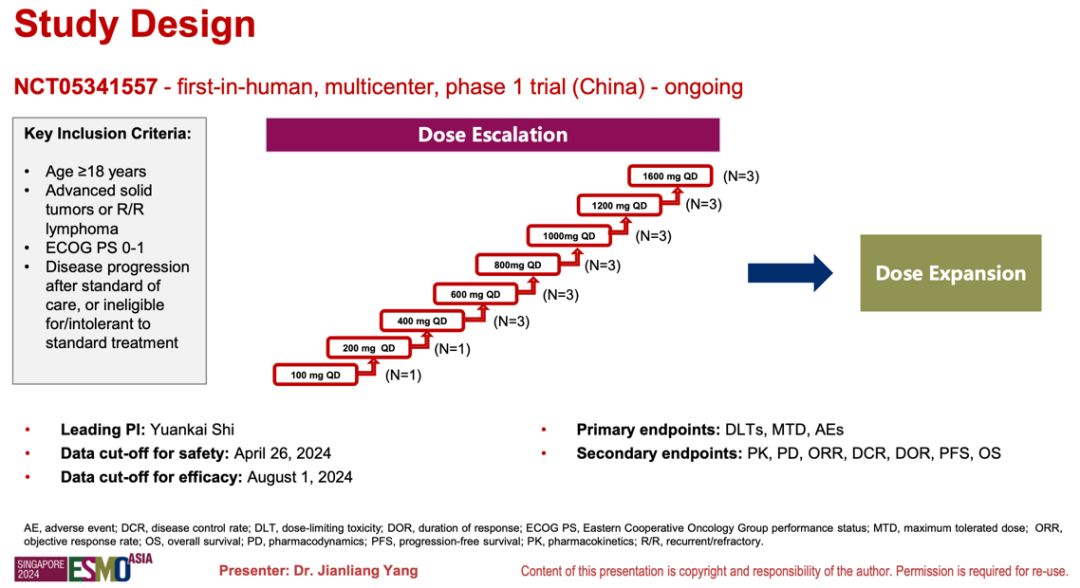 该研究是BPI-371153的首次人体试验,是一个多中心的I期临床试验。患者纳入标准主要包括:年龄≥18岁;晚期实体瘤或复发/难治性淋巴瘤;ECOG PS评分0-1;标准治疗后疾病进展,或不适合/无法耐受标准治疗的患者。剂量爬坡设计剂量范围自100 mg QD至1600 mg QD,共8个剂量组。主要研究终点包括剂量限制性毒性(DLTs)、最大耐受剂量(MTD)和不良事件(AEs)。次要研究终点包括药代动力学(PK)、药效动力学(PD)、客观缓解率(ORR)、疾病控制率(DCR)、缓解持续时间(DoR)、无进展生存期(PFS)和总生存期(OS)。安全性数据截止日期为2024年4月26日,疗效数据截止日期为2024年8月1日。(图1)