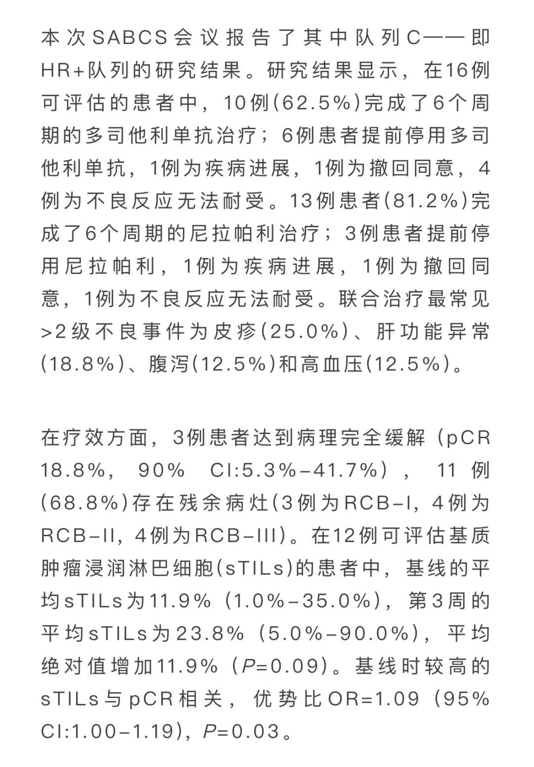 李曼教授:PARPi已获得批准用于治疗携带gBRCA1/2m的晚期和早期治疗乳腺癌患者,并且在携带gPALB2m的患者中也初步显示出了疗效。临床前数据表明,PARPi的暴露可导致肿瘤内促炎性cGAS/STING通路的激活,通过招募更多CD8+T细胞使得携带gBRCAm的肿瘤对免疫治疗敏感。基于此,TBCRC 056对PARPi与抗PD-1联合治疗进行了尝试,在HR+队列中取得了18.8%的pCR率,并且在第3周观察到sTILs平均绝对值增加了11.9%,为携带gBRCAm的HR+早期乳腺癌新辅助治疗提供一种新型联合治疗候选方案,未来期待后续研究数据进一步更新,不断优化HR+乳腺癌新辅助治疗新格局。
