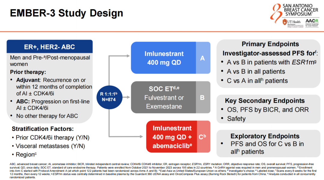 本次大会公布的EMBER-3研究(摘要号:GS1-01)就是该领域的探索之一。该研究探讨了SERD(Imlunestrant)作为单药治疗以及与阿贝西利联合治疗在ER阳性、HER2阴性晚期乳腺癌患者中的疗效和安全性。结果显示,Imlunestrant单药治疗在ESR1突变患者中(较SOC)显著改善了无进展生存期;Imlunestrant联合阿贝西利相较于Imlunestrant单药组显著提高了PFS。这一结果非常令人兴奋,为这类乳腺癌的治疗提供了很好的依据。