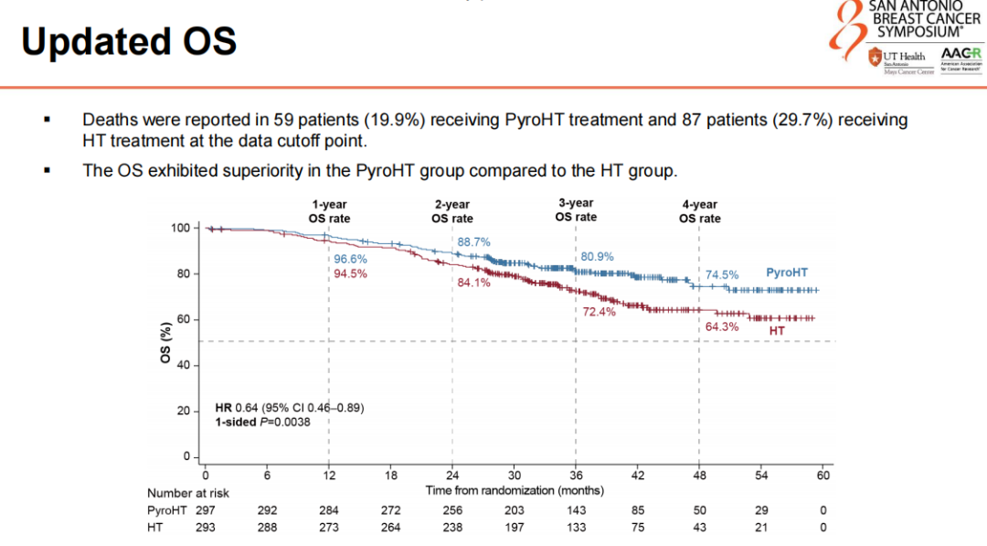 在HER2阳性乳腺癌治疗领域,我想分享两项来自中国学者的研究。首先是徐兵河院士报道的PHILA研究的最终PFS的数据,研究结果显示,PyroHT组与HT组的中位随访时间分别为35.7个月和34.3个月,PyroHT组和HT组研究者评估的中位PFS分别为22.1个月vs.10.5个月(HR=0.44,95%CI:0.36~0.53;P<0.0001),显著的高于HT组,OS数据尽管还不是很成熟,也显示出良好的获益趋势。