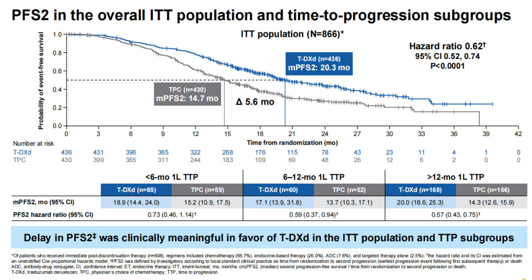在ITT人群和TTP亚组分析中,PFS2的延迟对T-DXd具有临床意义。